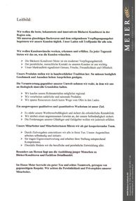 Seit Januar 2016 übernahm das Ehepaar Manuela und Martin Meier die Traditionsbäckerei Eberhard. Unter der neuen Marke MEIER BÄCKEREI CONFISERIE wird in bewährter Art gebacken und mit Passion Süsses kreiert. Martin Meier war zuvor 15 Jahren in der Bäckerei-Konditorei Eberhard tätig und somit bestens mit dem Handwerk und den Rezepten vertraut. Manuela Meier, ausgebildete Bäckerin-Konditorin, hat neben der Betreuung ihrer fünfköpfigen Familie, einen erfolgreichen Partyservice aufgebaut.